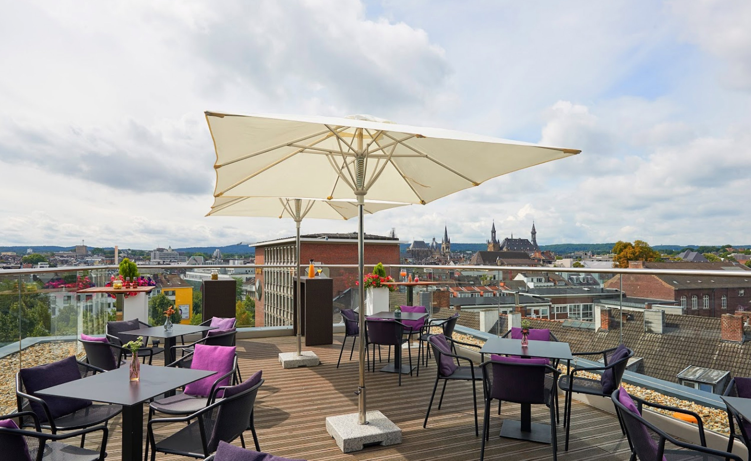 Erleben Sie eine exklusive Lounge-Atmosphäre mit puristischem Design und Wohlfühl-Charakter. Genießen Sie einen atemberaubenden Ausblick über die Dächer von Aachen.